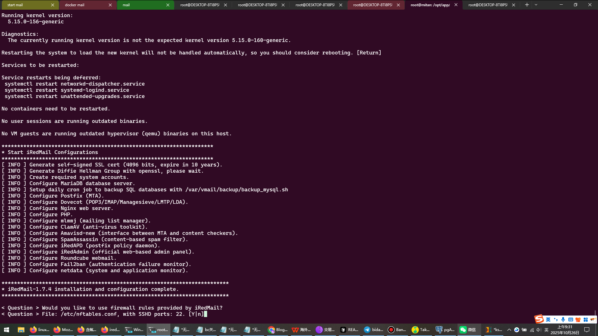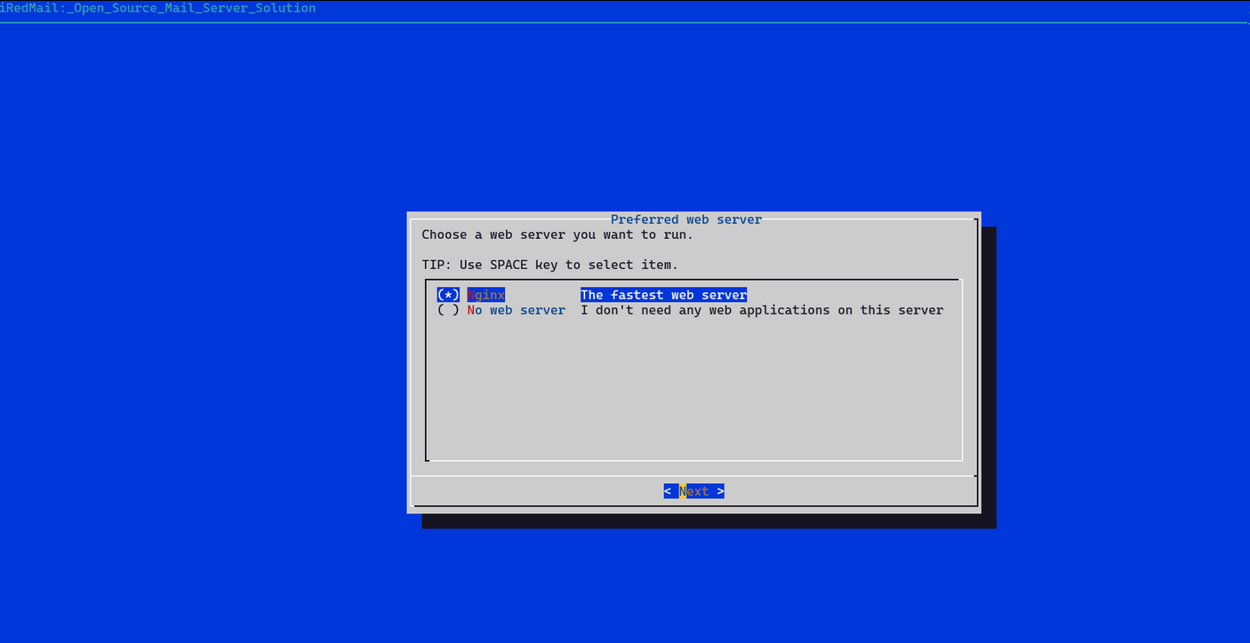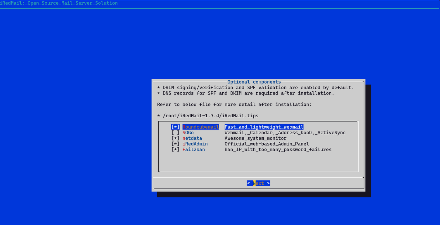 * Additional components: Roundcubemail netdata iRedAdmin Fail2ban